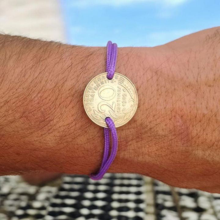 Chaque bracelet célèbre l’année qui vous tient à cœur – une naissance, une rencontre, un moment unique – grâce à une véritable pièce de monnaie française : 20 centimes de franc Marianne (1962 à 2000). Un bijou chargé d’émotion et d’histoire.